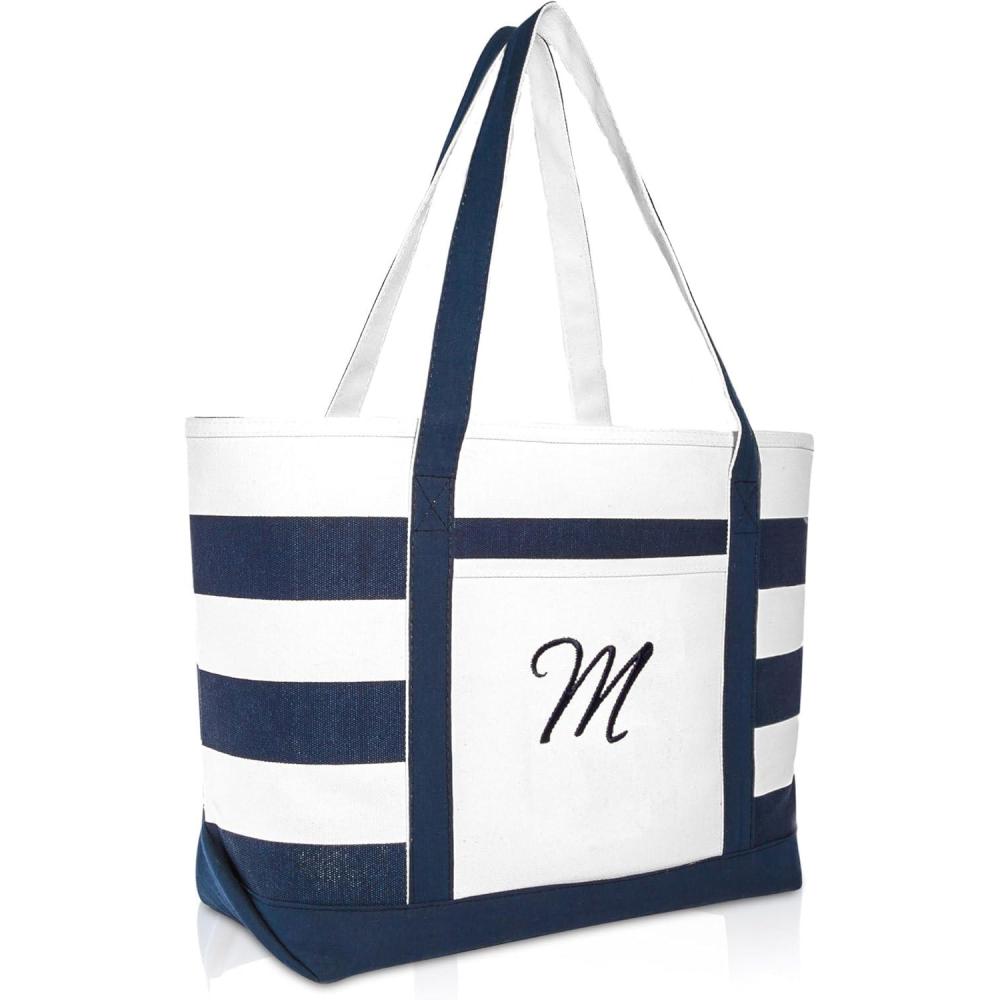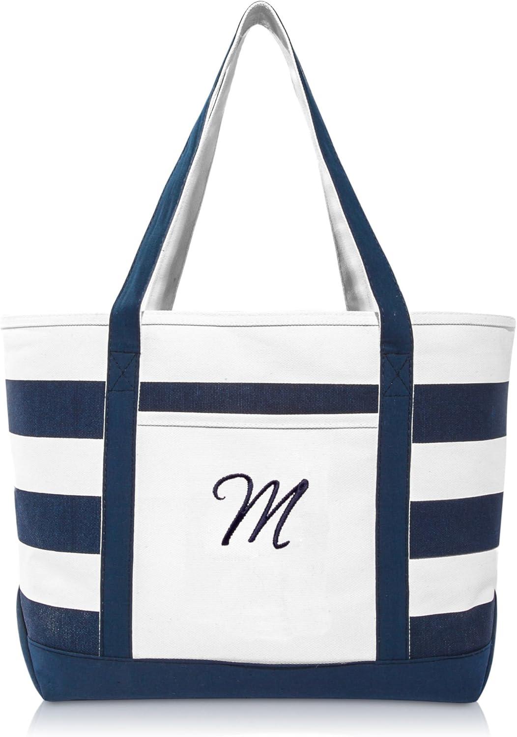 DALIX Premium Beach Bags Striped Navy Blue Zippered Tote Bag Monogrammed A – Z(M)