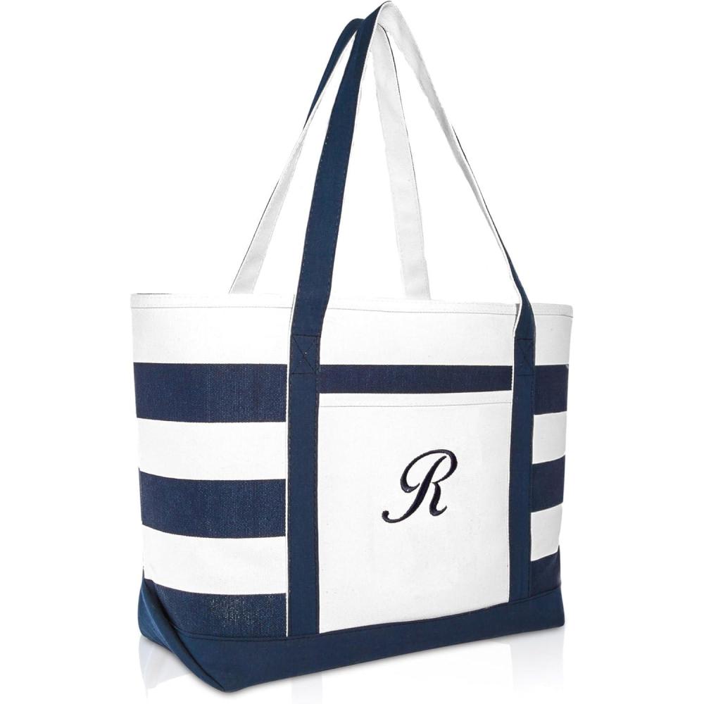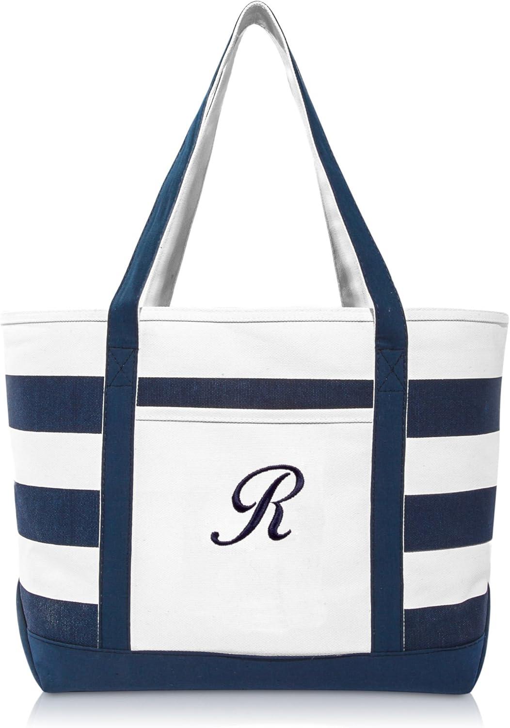 DALIX Premium Beach Bags Striped Navy Blue Zippered Tote Bag Monogrammed A – Z(R)