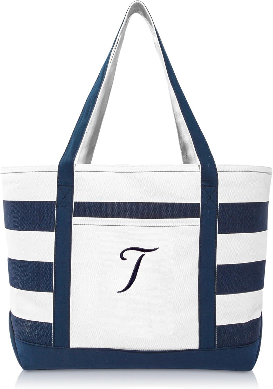 DALIX Premium Beach Bags Striped Navy Blue Zippered Tote Bag Monogrammed A – Z(T)