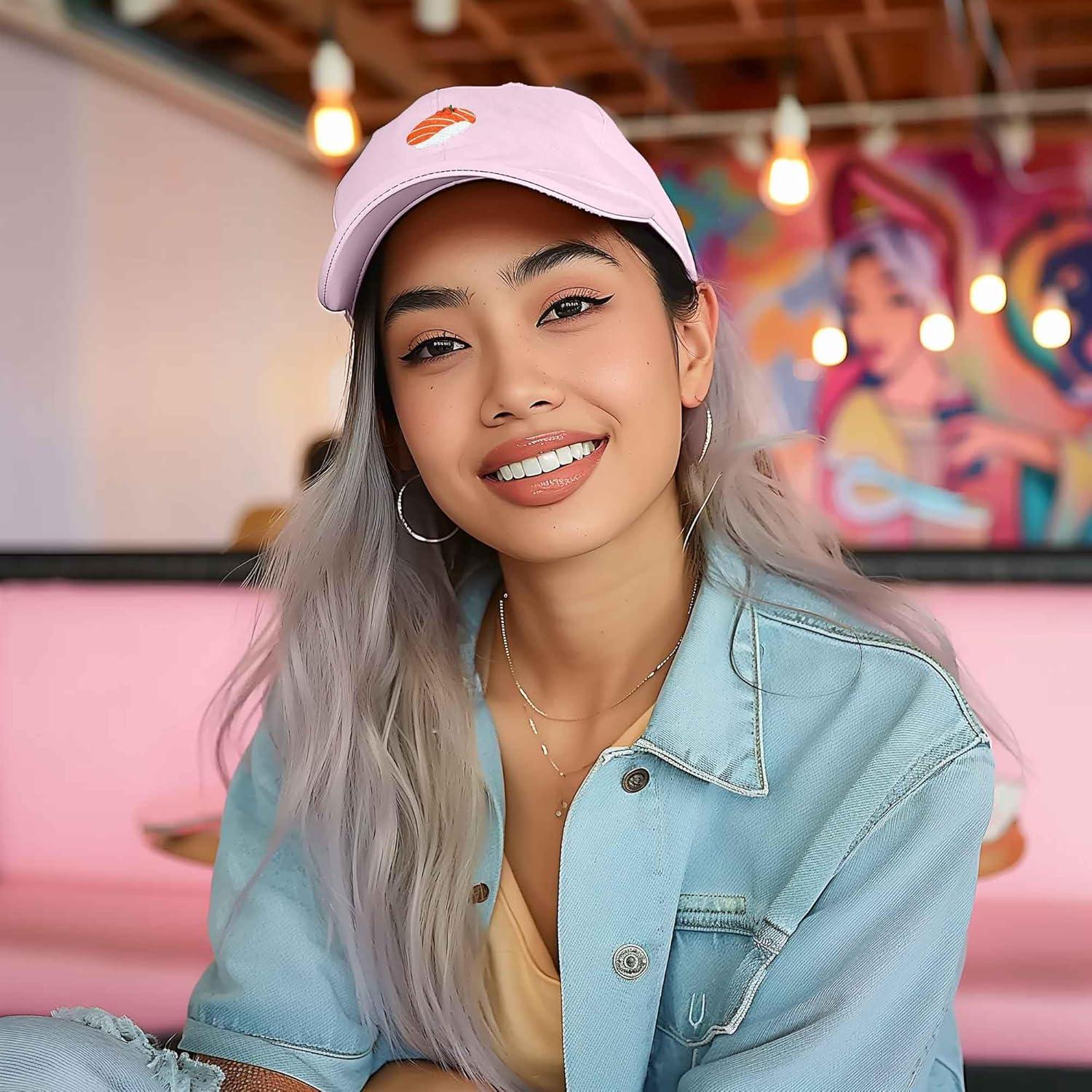 Elevate your casual style with our women's baseball cap featuring a charming Salmon Nigiri embroidery. This dad cap is perfect for any outing, providing comfort and convenience with its soft, breathable fabric and unstructured crown, making it a versatile addition to your wardrobe. The adjustable strap with a buckle ensures a secure fit, accommodating all hair styles effortlessly. Whether you’re heading to work, enjoying a day out with friends, or adding a unique touch to your outfit, this cap matches everything and brings a playful yet stylish element to your look. This cap is ideal for a variety of activities. Wear it for a relaxed day at the beach, casual coffee dates, outdoor festivals, weekend shopping trips, or even a spontaneous road trip. With its trendy and comfortable design, this cap seamlessly integrates into your everyday adventures. One Size Fit Most