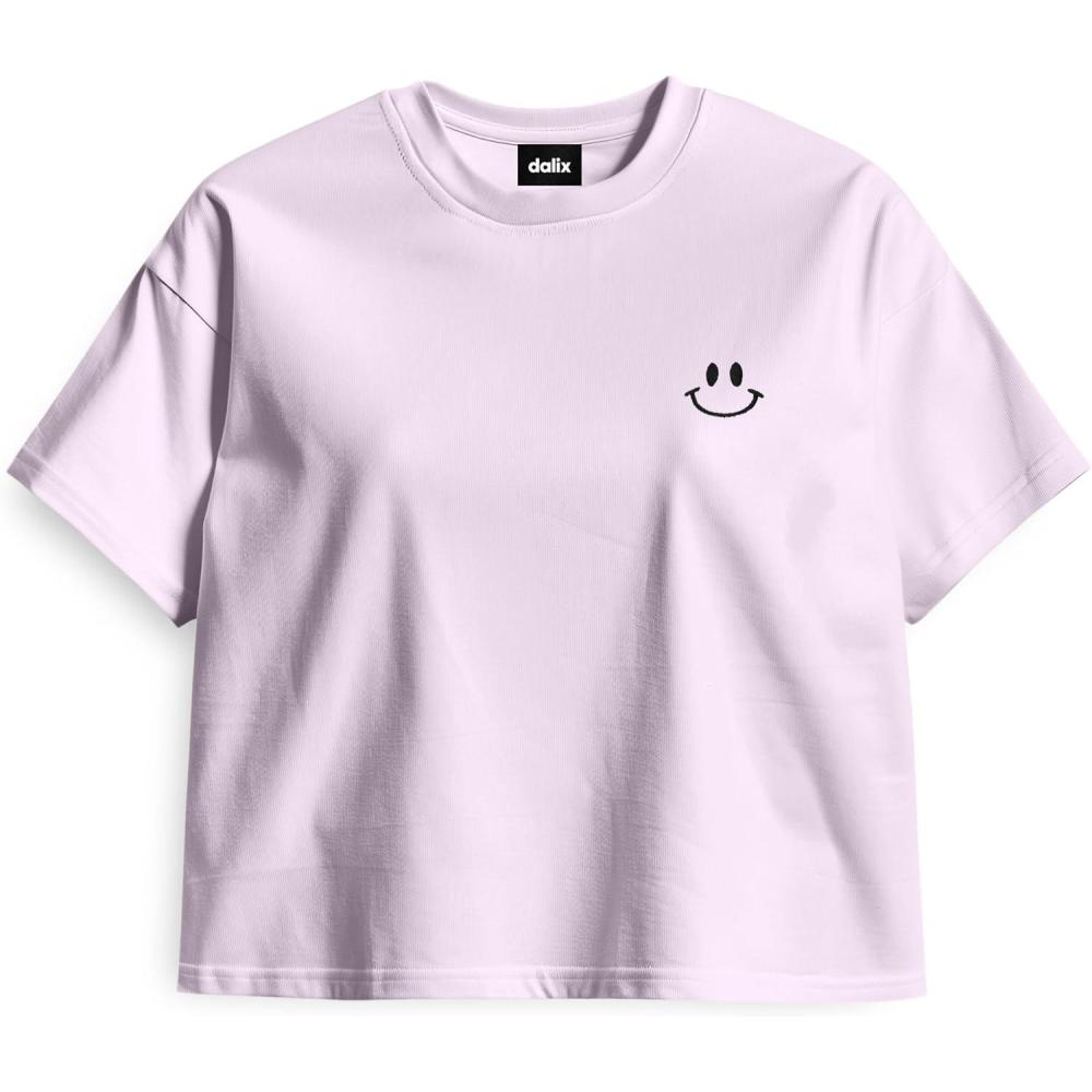 DALIX Smile Face Boxy Short Sleeve Tee Relaxed Summer Cotton Garment Dyed Womens(Orchid)